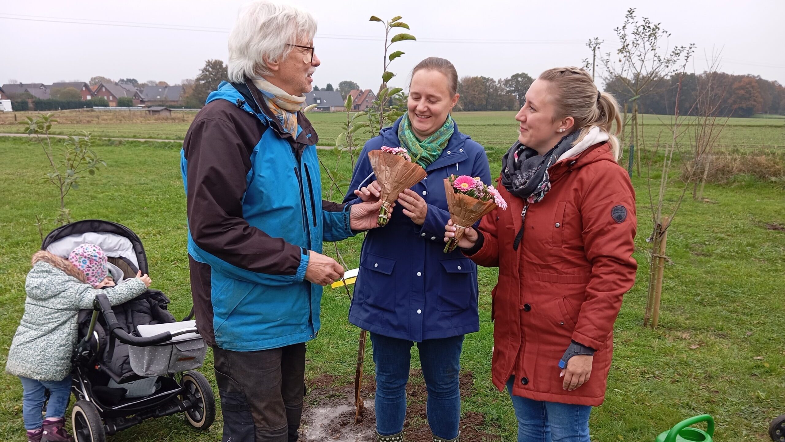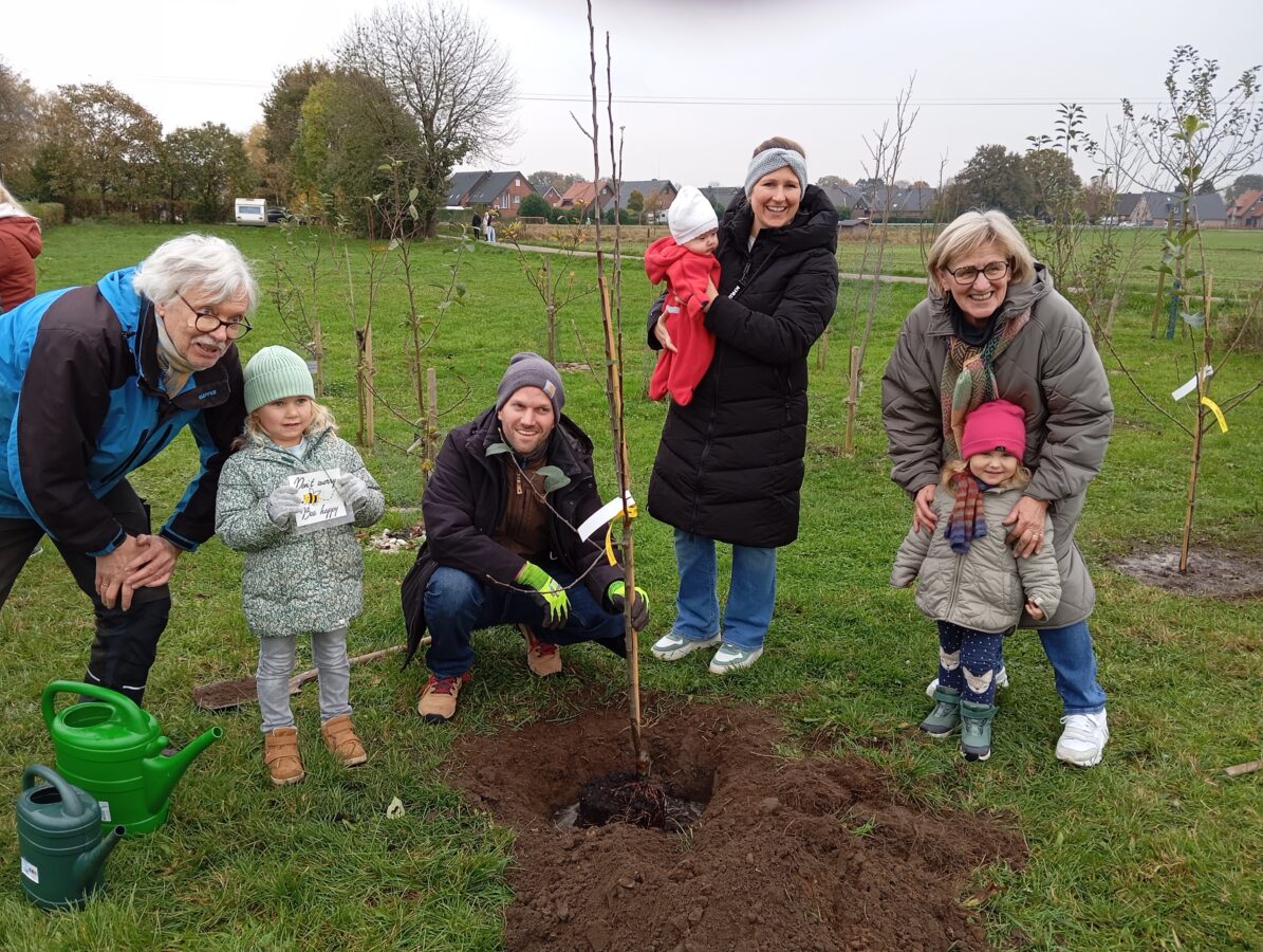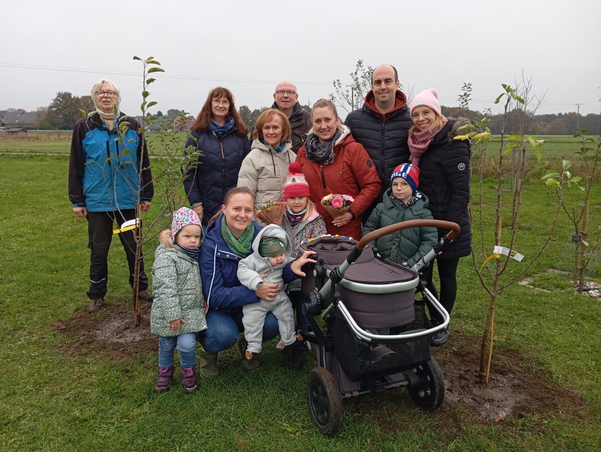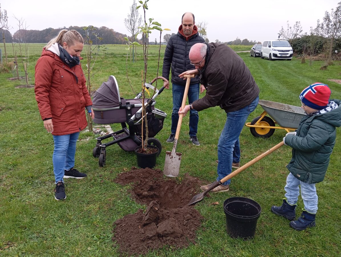 Seit November 2017 pflanzen Eltern für ihre Kinder Obstbäume auf der Babywiese des Heimatvereins. Bei der nunmehr 8. Pflanzung konnte nun aufgrund des ungebrochenen Interesses der 100. Obstbaum gepflanzt werden. Es ist ein Klarapfel, den Lisa und Johannes Paus für ihren Sohn Toni mit Hilfe von Familienangehörigen in die Erde potteten. Lisas Schwester Elke Becker pflanzte für ihren Sohn Timo den 101. Baum, einen Apfel Cox-Orange. Die Großeltern und die weitere Verwandtschaft verfolgten amüsiert die Planzarbeiten.
