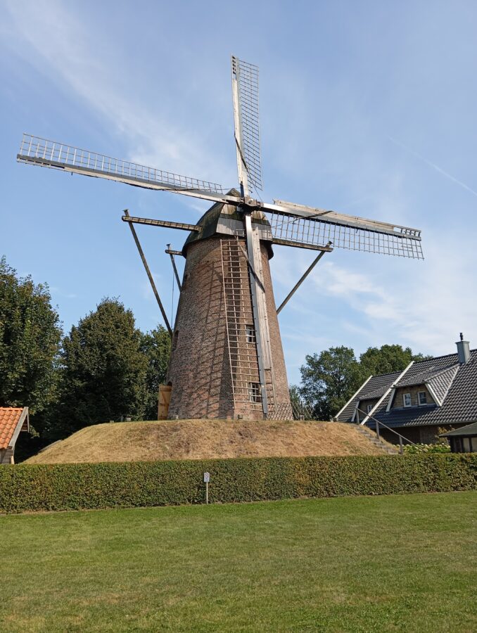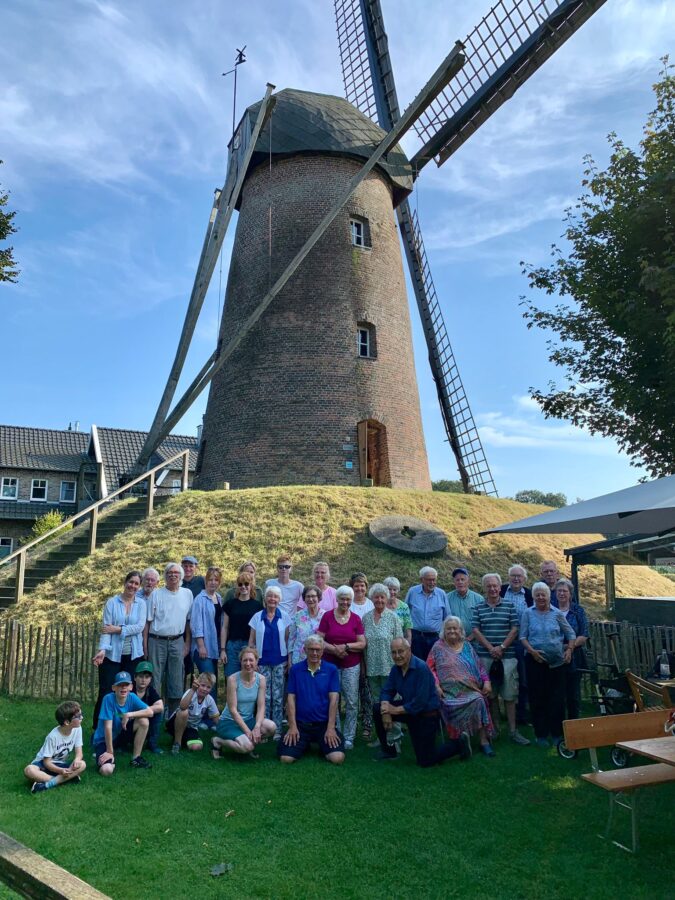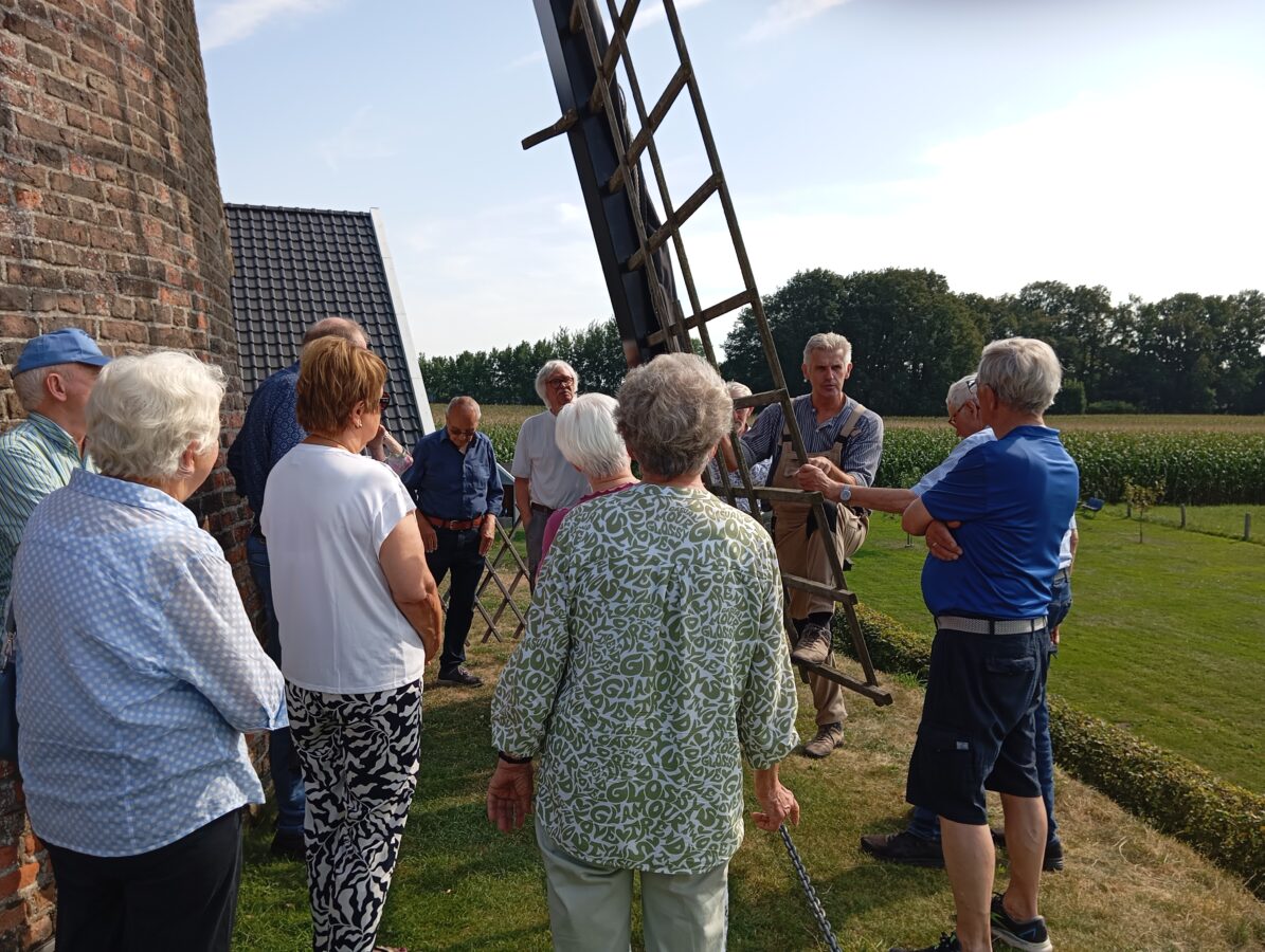 Der diesjährige Ausflug führte die Erler Heimatfreunde am Sonntag, 1. 9. , zur Habers-Mühle nach Rhede-Krommert. Mit Rad und PKW ging es bei herrlichem Wetter zu der 1881 erbauten Turmwindmühle. Dort erklärte Ludger Holtschlag vom Verein „Mühlenpower Krommert e.V.“ in zwei Führungen sehr kompetent die Geschichte und Funktionsweise der Holländer-Mühle. 20 Jahre wurde sie von Windkraft angetrieben. Danach hat man versucht, die Mühle mit angebauter Motorkraft (Dampfkraft, Diesel- und Elektromotor) noch weitere 20 Jahre zu betreiben. Doch 1925 stellte Habers den Betrieb ein. 1936 wurde die Mühle unter Denkmalschutz gestellt. Es dauerte Jahrzehnte, bis sie umfassend saniert war, zumal 1983 ein Sturm die Flügel aus der Verankerung gerissen hatte. Erst mit der Gründung des Vereins „Mühlenpower Krommert e.V.“ konnte die Renovierung ab 2013 soweit vorangetrieben werden, dass die Mühle wieder vollkommen funktionsfähig wurde. Seitdem ist sie auch ein Lern- und Veranstaltungsort. Es wurde eine Remise errichtet und ein Vorplatz für Tische und Bänke angelegt, so dass dort Veranstaltungen stattfinden können. In der Mühle können sich Paare im historischem Ambiente trauen lassen.