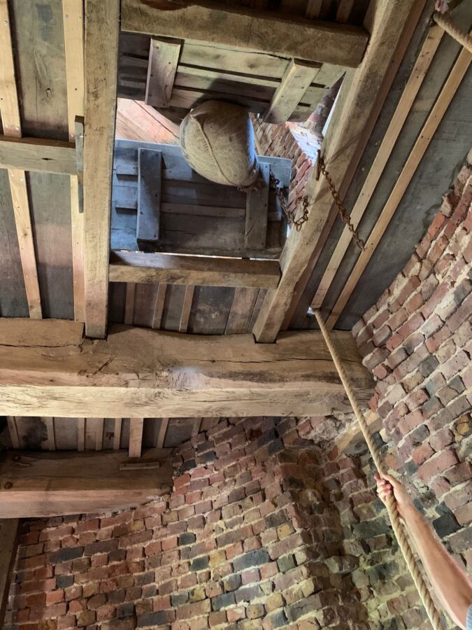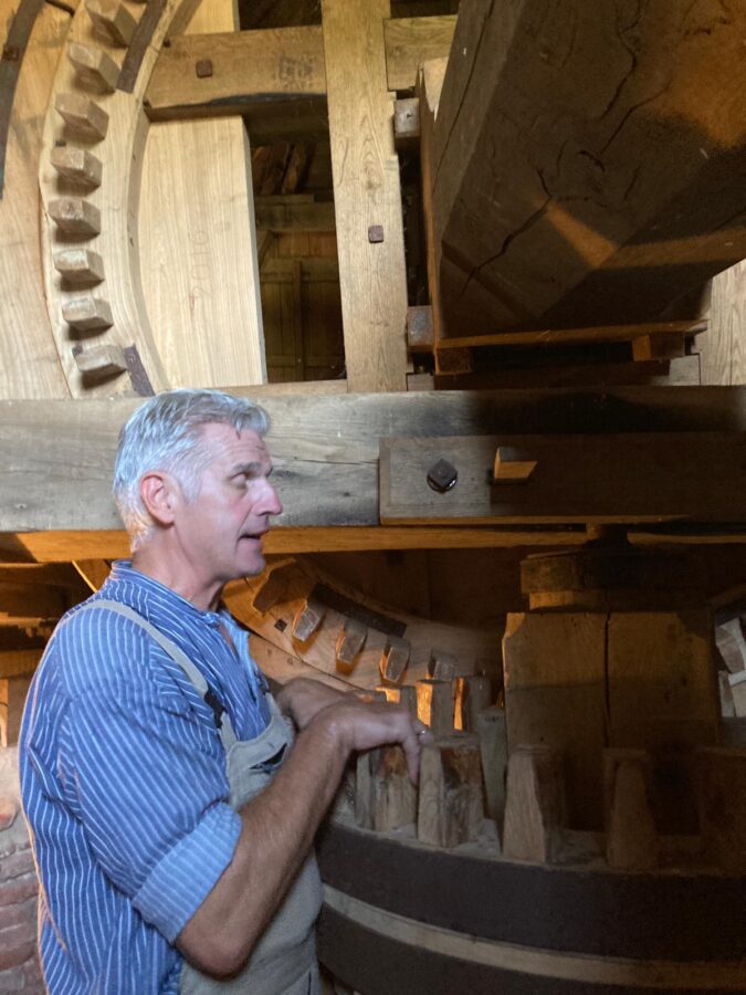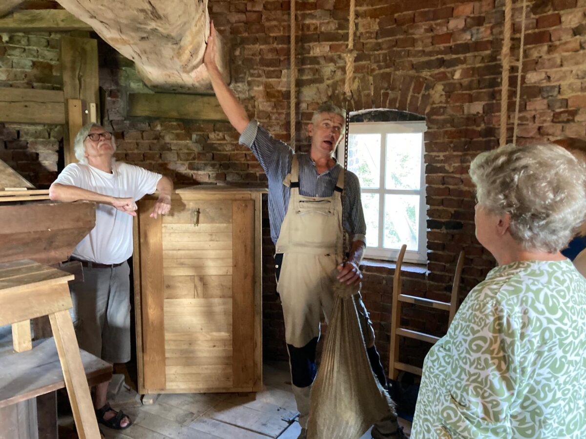 Ludger Holtschlag zeigte den Erlern die Inbetriebnahme der Mühle in allen Einzelheiten, den jungen Familien mit Kindern auf hochdeutsch, den Älteren auf Platt. Zuerst wird die Mühlenkappe per Hand in die Windrichtung gedreht, was der Fachmann „Krühen“ nennt. Dann werden die Flügel besegelt, d. h. das eingerollte Segeltuch wird auf die Flügel gezogen. Vor Beginn des Mahlvorgangs wird in der Mühle der passende Mahlgang eingelegt und die Bremse gelöst.
