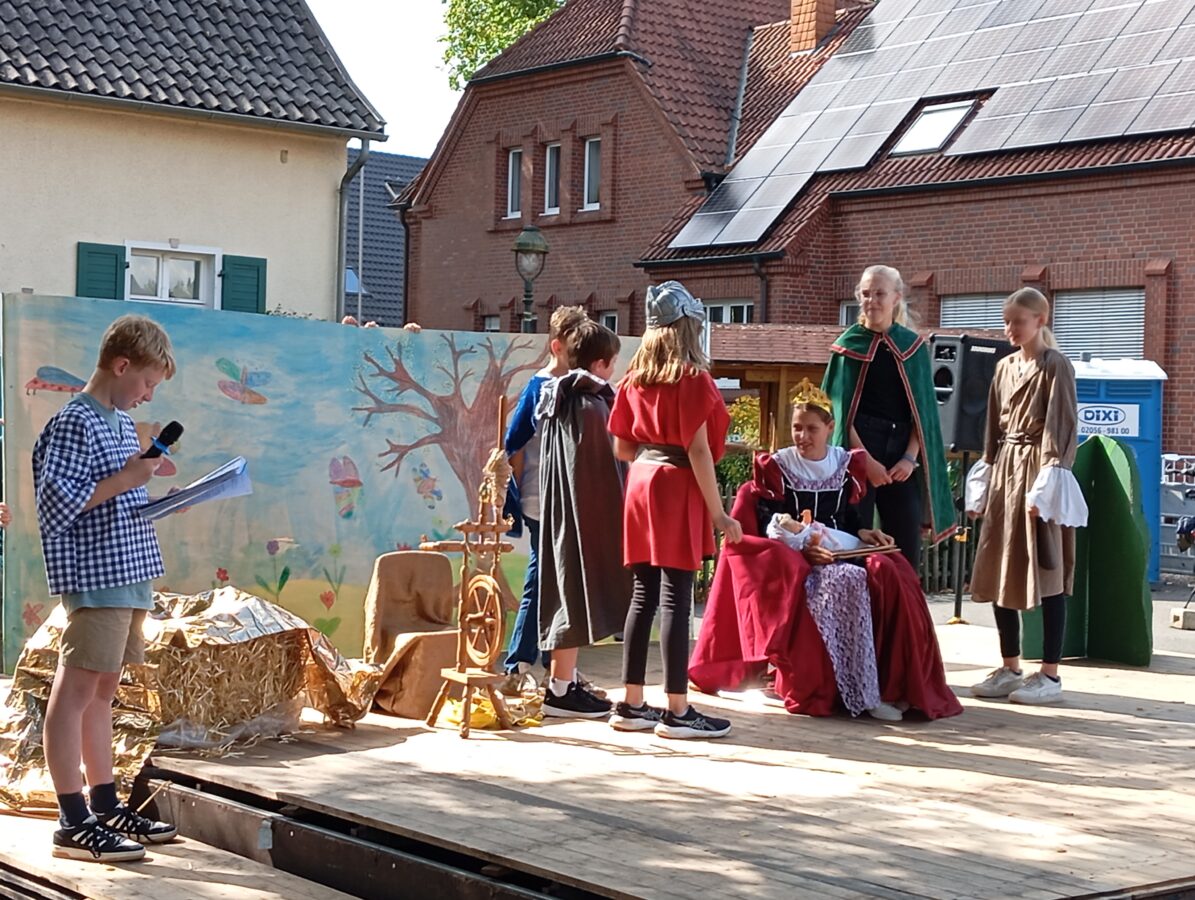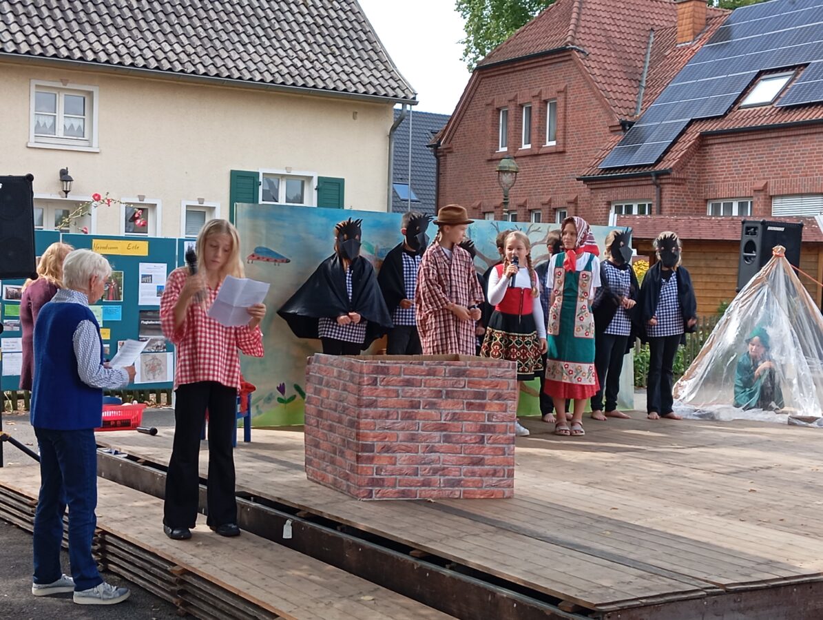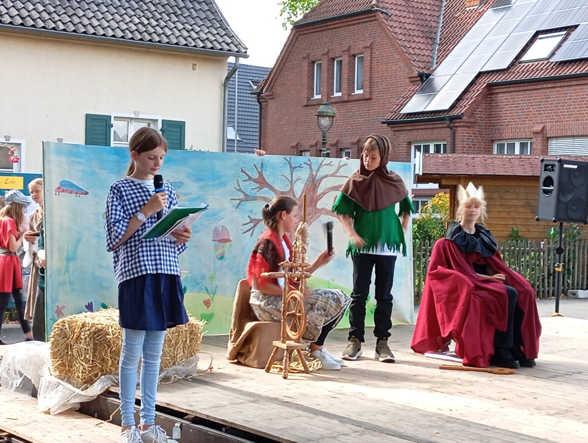 Die großen und kleinen Brejpottspöllers unterhielten die Gäste beim Sommerfest auf dem Schulhof wieder mit zwei plattdeutschen Märchenaufführungen: „De sewwen Rawen“ und „Rumpelstilzken“. Es war wieder beeindruckend, wie die Kinder auf der Bühne in prächtigen Kostümen diese alten Märchenerzählungen darboten.