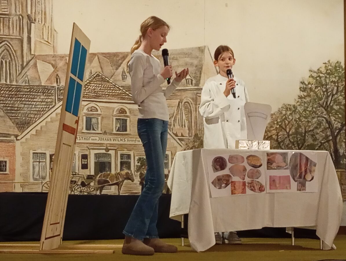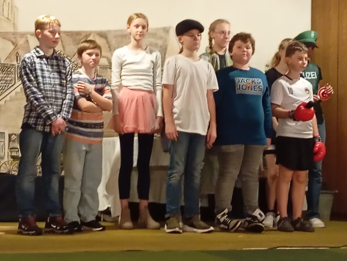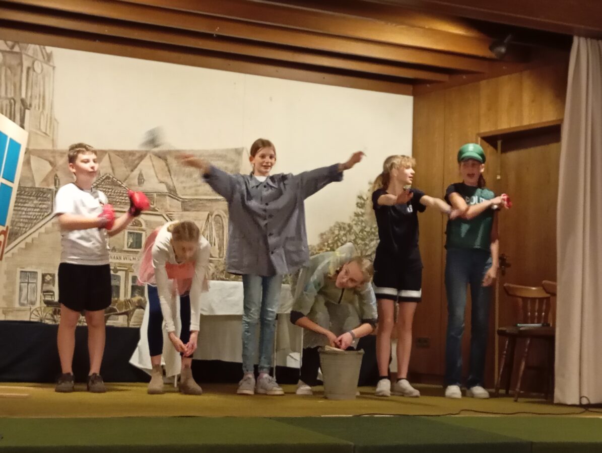 Alte Streiche wie Klingelmänneken und das Portemonnaie am Faden oder das „heiße Höschen“, das die halbwüchsige Tochter unbedingt haben wollte – in den 1970ern „hot pants“ genannt, – erinnerten viele im Publikum an ihre eigene Kinderzeit. „Eene Pulle Pommes“, der aus dem Fernsehen bekannte Sketch von Didi Hallervorden klang auf Platt noch origineller. Ganz neu im Programm waren zwei Streiche von Max und Moritz und Till Eulenspiegel. Ingrid Horstmann, die Leiterin der AG, hatte den dritten Streich der beiden Lausbuben als „Schnieder Böck“ und den bekannten Eulenspiegelstreich als „Wie Eulenspeegel denn Äsel das Lääsen bibroch“ ins Erler Platt übersetzt. Hier war zu sehen, wie mit einfachen, aber raffinierten Mitteln das passende Bühnenbild gezaubert wird, damit Schneider Böck durch den angesägten Steg (einen Karton) ins Wasser (blauer Müllsack) fiel und der Esel in einem selbst genähten Eselskostüm seine Lernfähigkeit mit den Buchstaben I und A unter Beweis stellte.