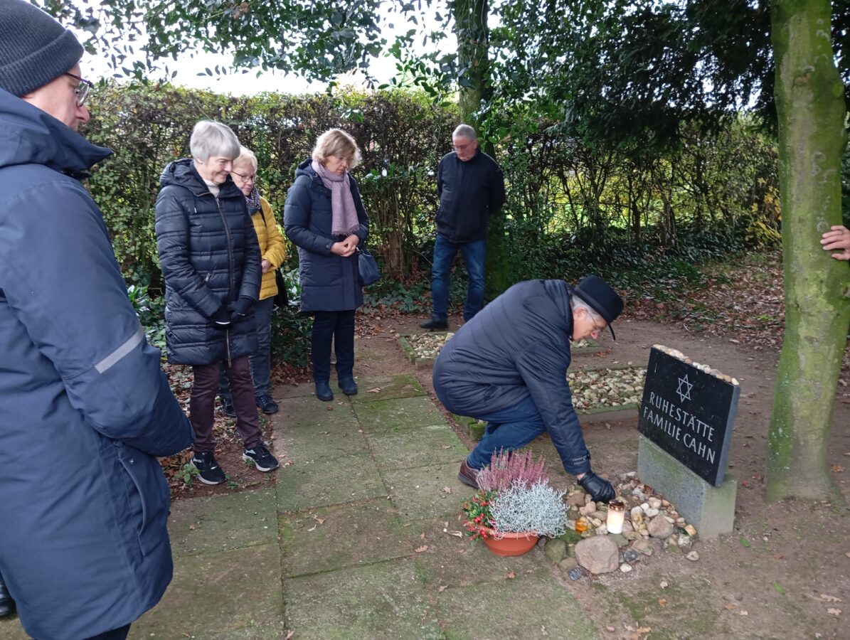 Danach las Ingrid Horstmann das Friedensgebet von Papst Franziskus vor, das um Versöhnung und Frieden zwischen verfeindeten Ländern und Gesellschaftsgruppen und für eine menschenwürdige Welt ohne Hunger und Armut, ohne Gewalt und Krieg bittet. Zum Abschluss sangen die Teilnehmer das Lied „Herr, gib uns deinen Frieden“ und legten auf dem Grabmal und den Gräbern der Familie Cahn nach jüdischer Sitte Steine nieder.