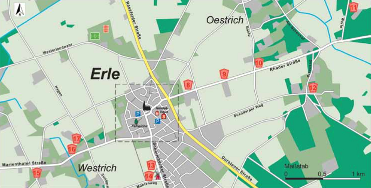 Die Stationen 1 bis 7 sind im Ortskern von Erle in einem Rundgang zu Fuß erreichbar.
