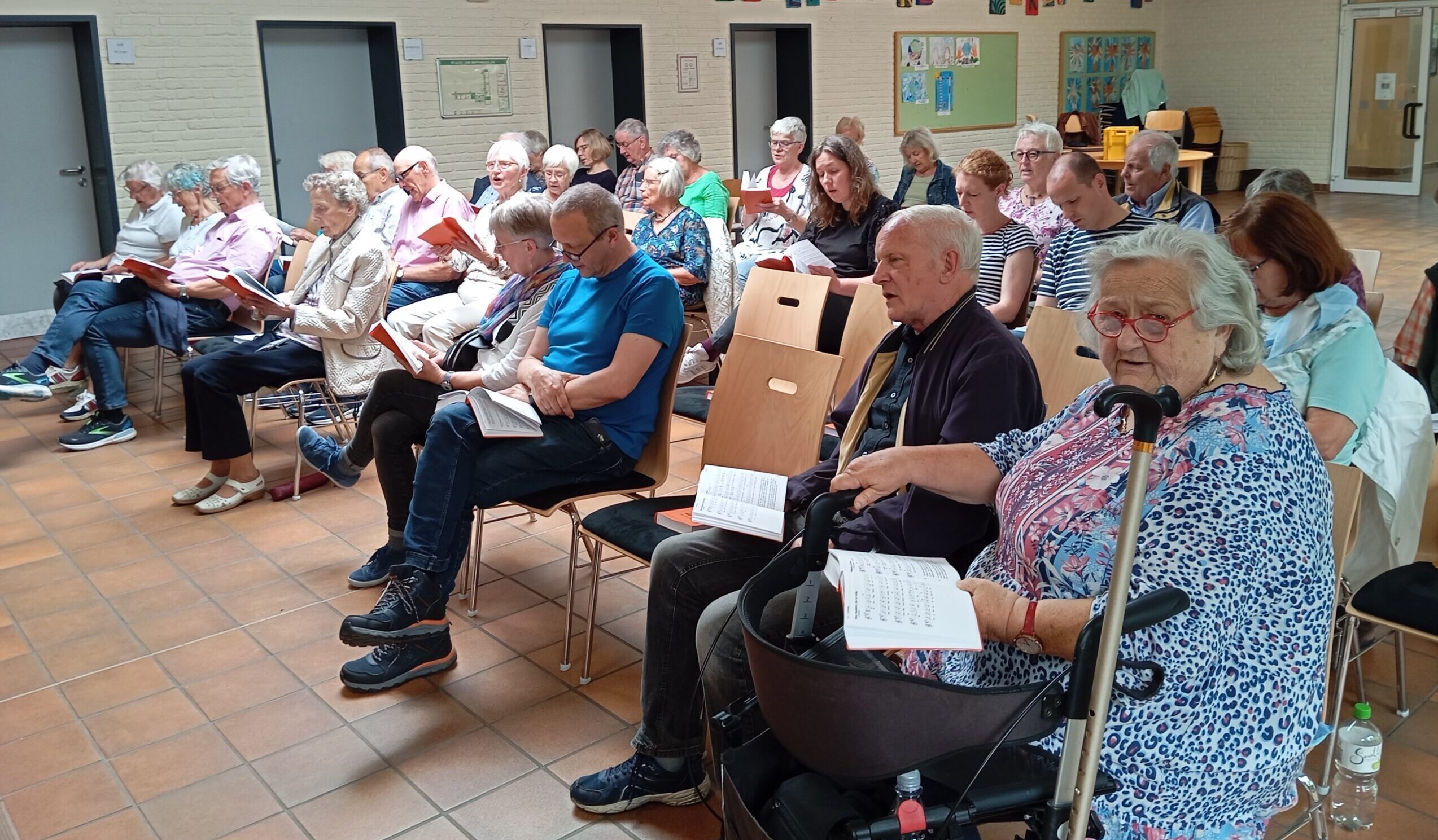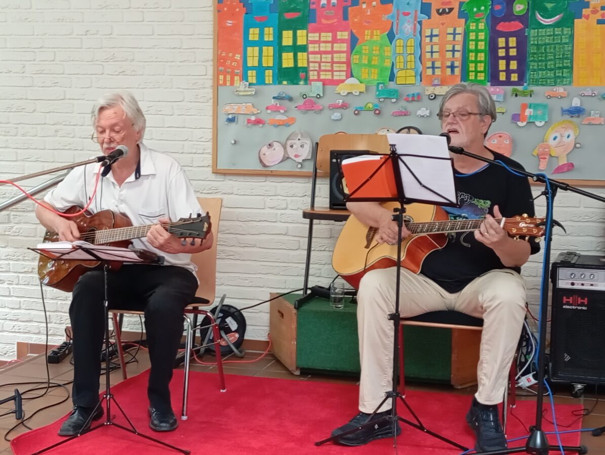 Zum offenen Singen hatte der Heimatverein am 30. Juni wegen der unsicheren Wetterlage in die Pausenhalle der Silversterschule statt zu Kastanienallee eingeladen. Ca. 40 Sängerinnen und Sänger waren der Einladung gefolgt. Norbert Sabellek und Markus Bremer begleiteten auf ihren Gitarren den Gesang. Im ersten Teil der Veranstaltung wurden alte deutsche Volks- und Fahrtenlieder gesungen wie z. B. : „Aus grauer Städte Mauern“, „Mein Vater war ein Wandersmann“, „Wenn die bunten Fahnen wehen“ oder „Zum Tanze da geht ein Mädel mit güldenem Band“. Ein weiteres Genre waren die Seemannslieder: „Heute an Bord“ und „My Bonnie is over the ocean“.
