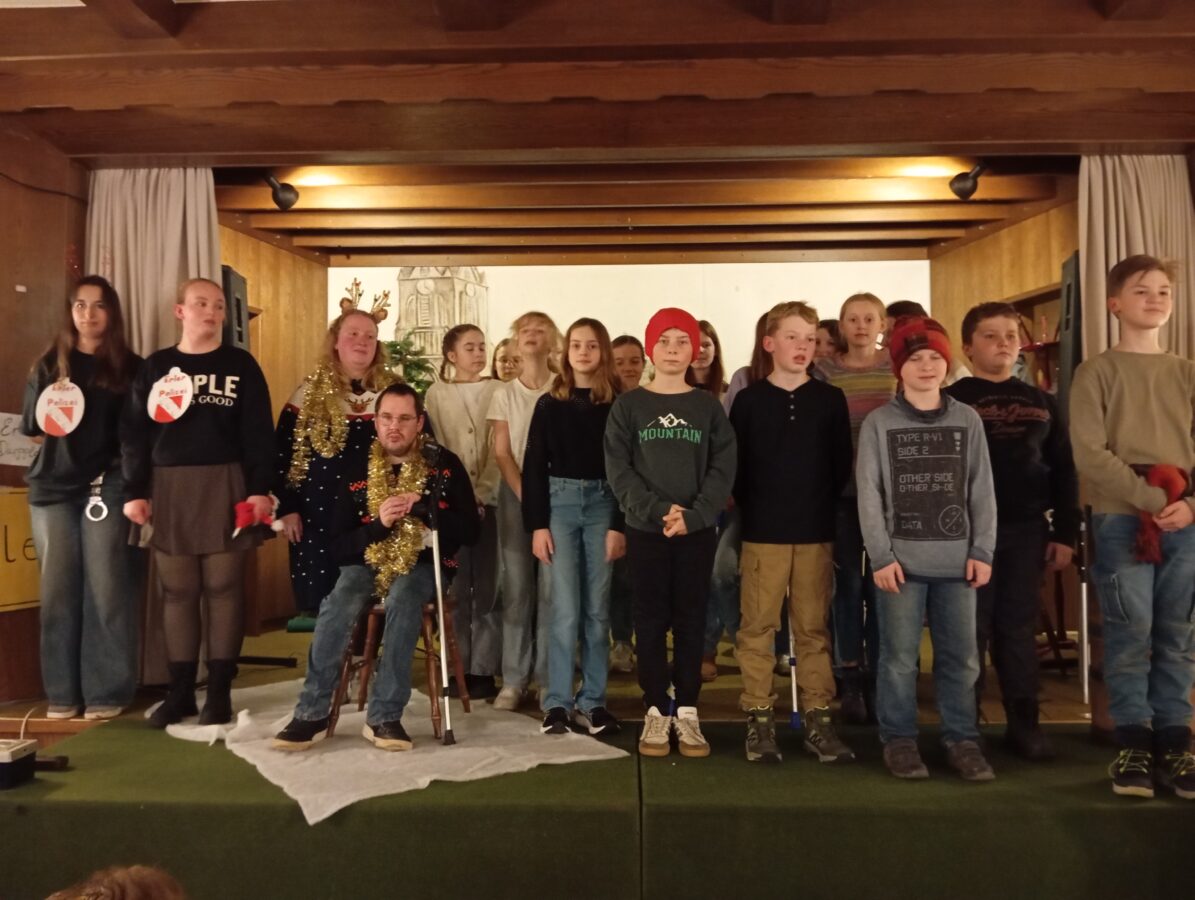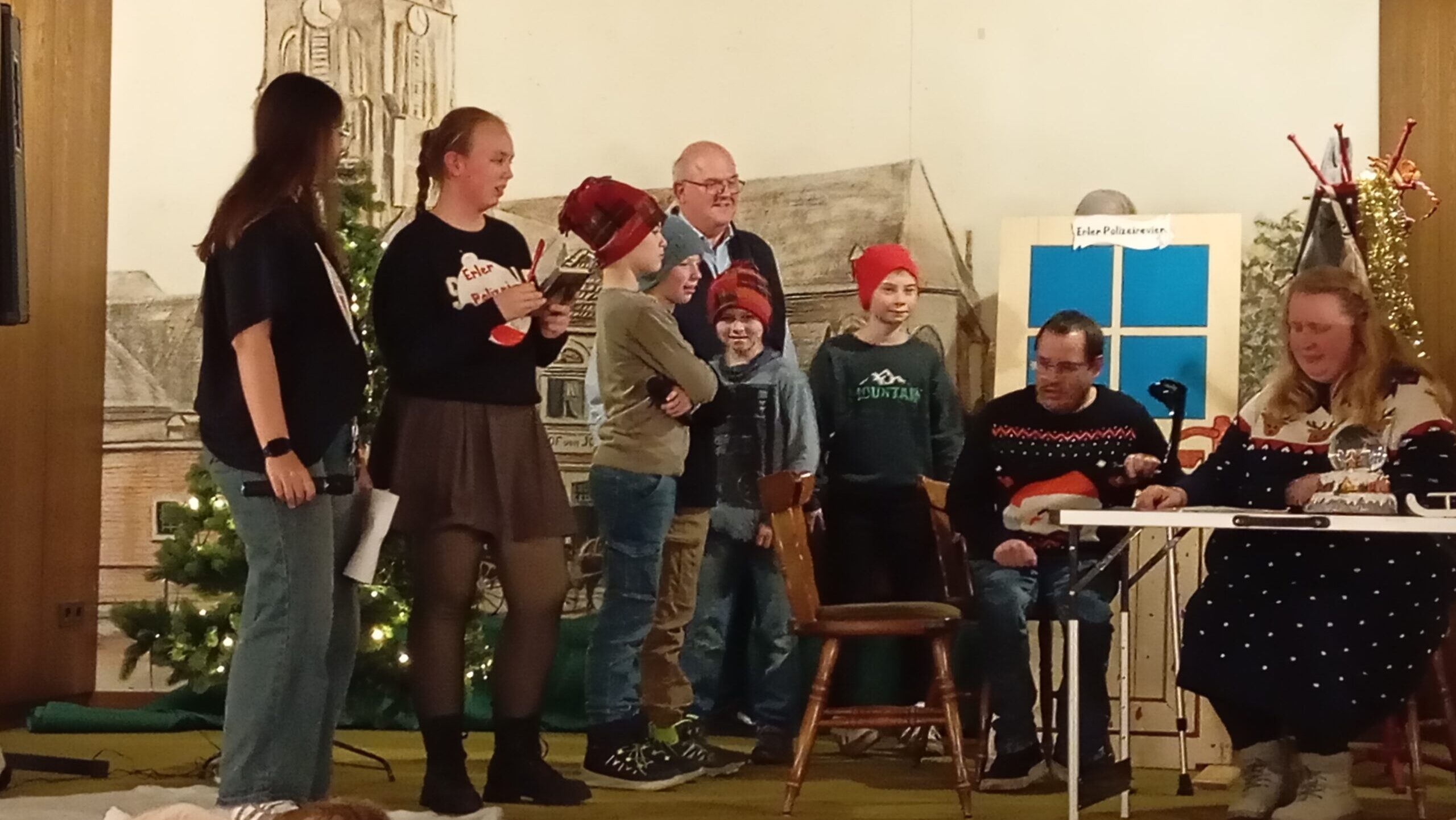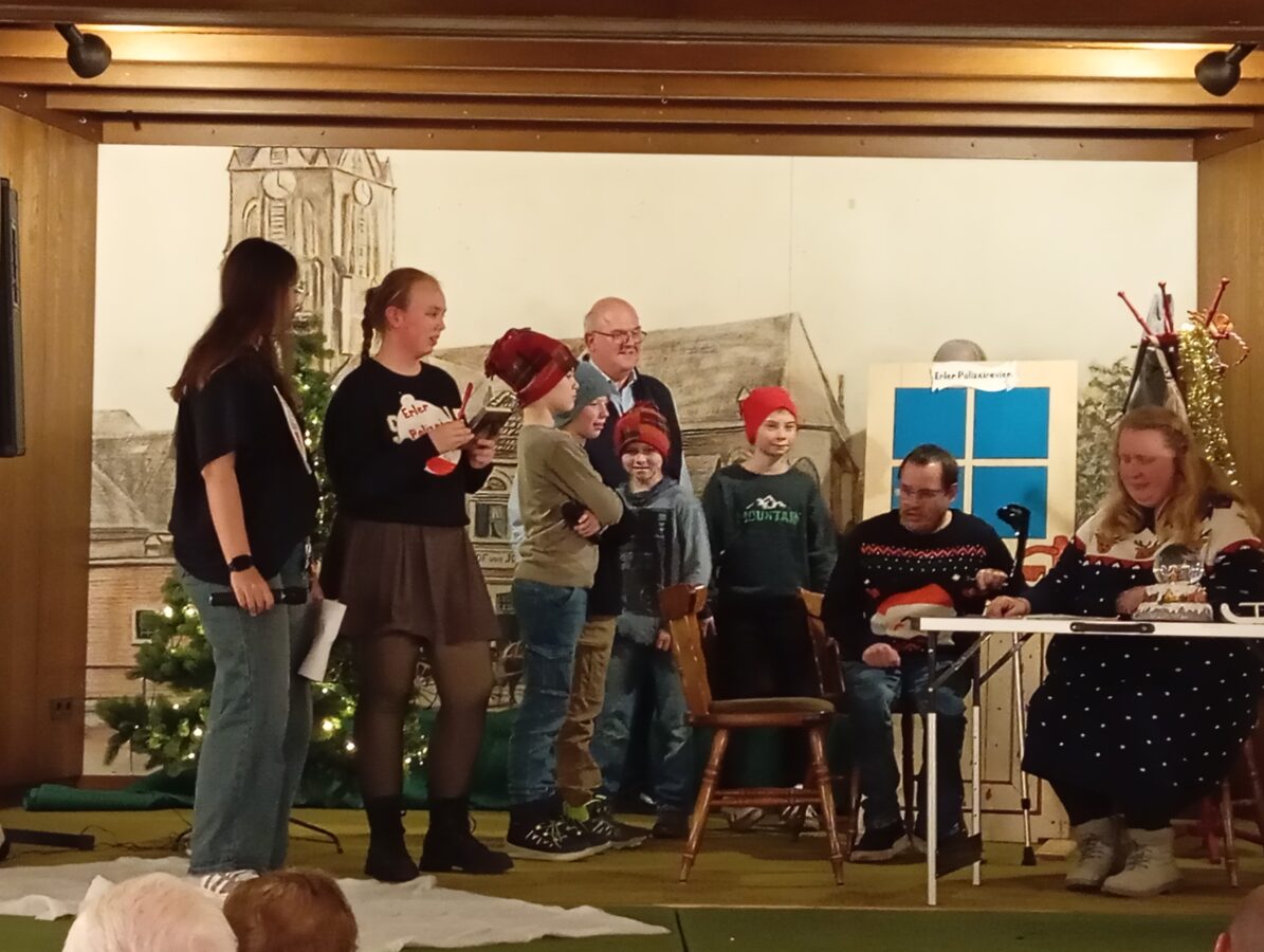 In die Vorweihnachtszeit passte der Rap „Wiehnachten steht vör de Döör, denn Boom, denn will wi schmücken“ in Form eines lustigen Bewegungsrhythmus´, bei dem sich die Agierenden mit den Kugeln, Sternen und Kerzen nicht in die Quere kommen durften. Hermann Jünck trug gekonnt den ins Platt übertragenen Zungenbrecher „Barbaras Rhabarberbar“ vor. Zur Stimmung trug zwischendurch das Singen plattdeutscher Weihnachts- und Heimatlieder bei, die Norbert Sabellek auf der Gitarre begleitete.